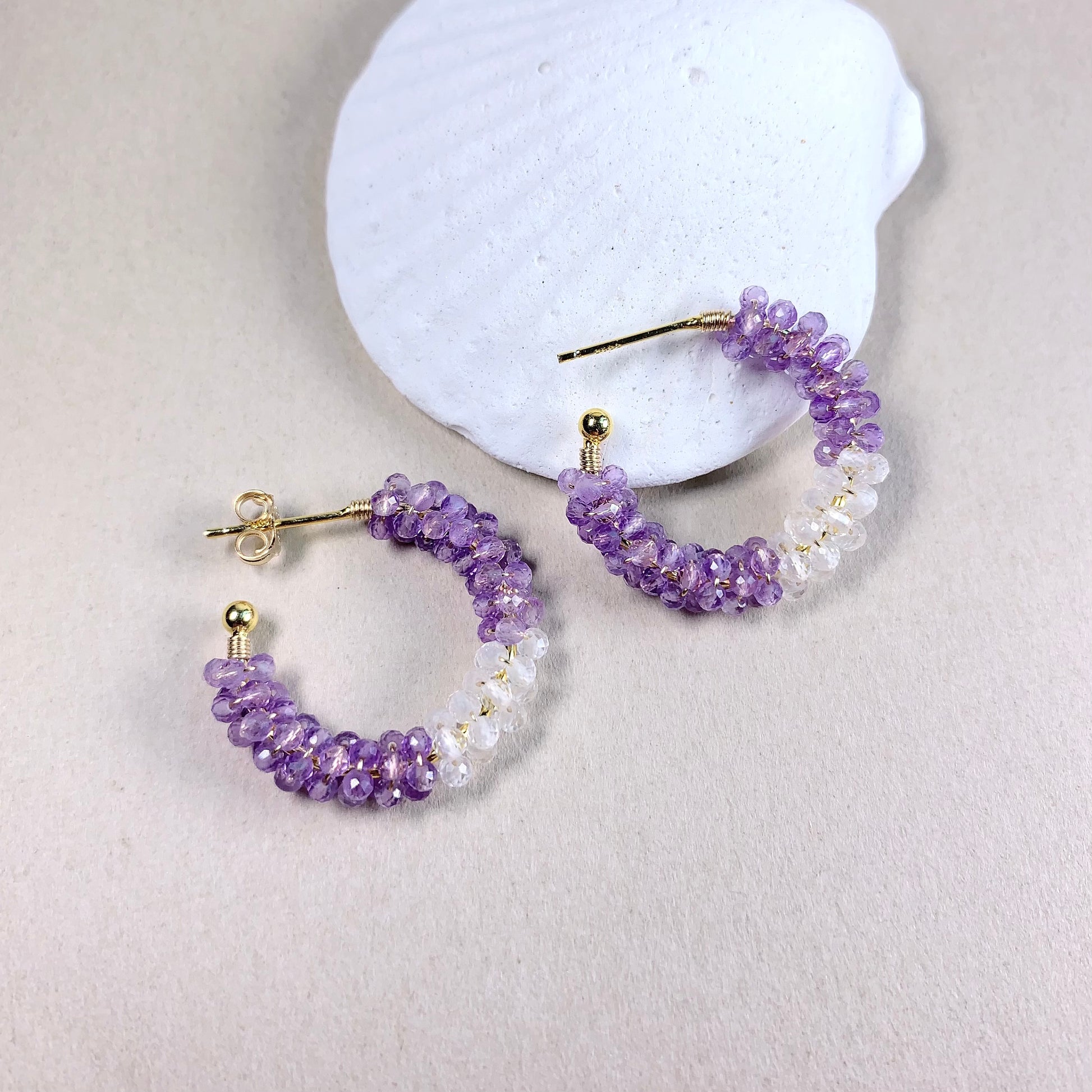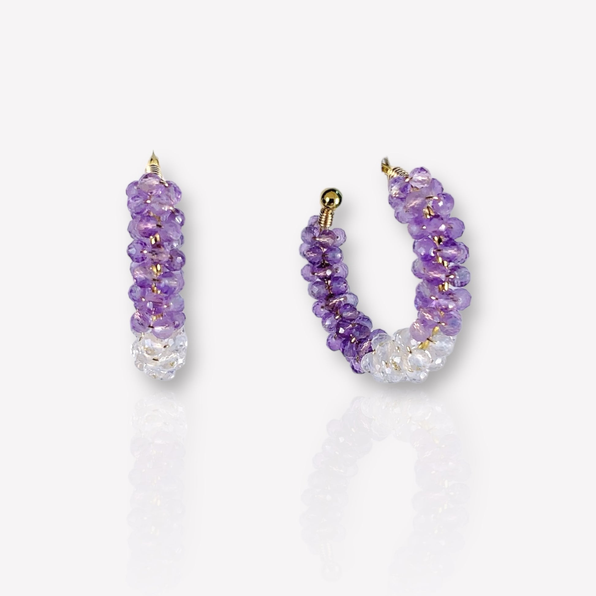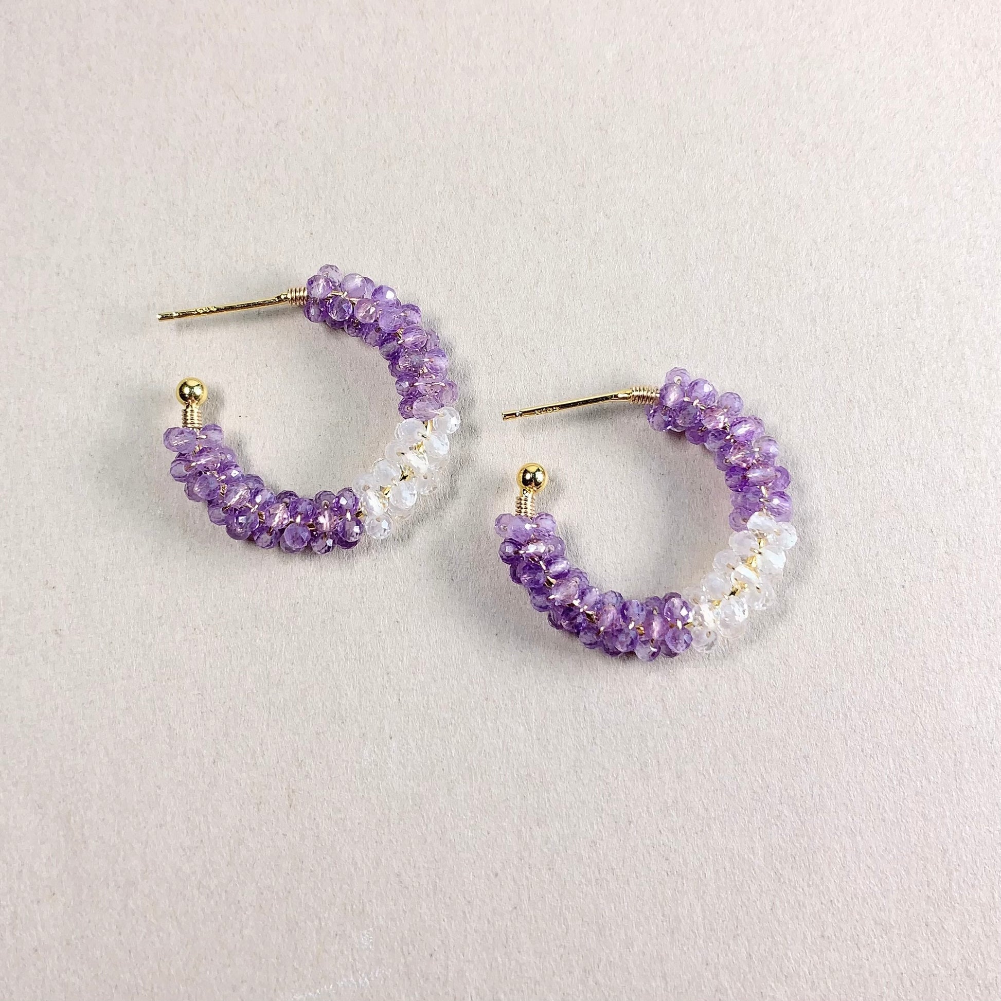 Tiny amethyst and crystal beads wrapped around the sterling silver open hoop earrings.