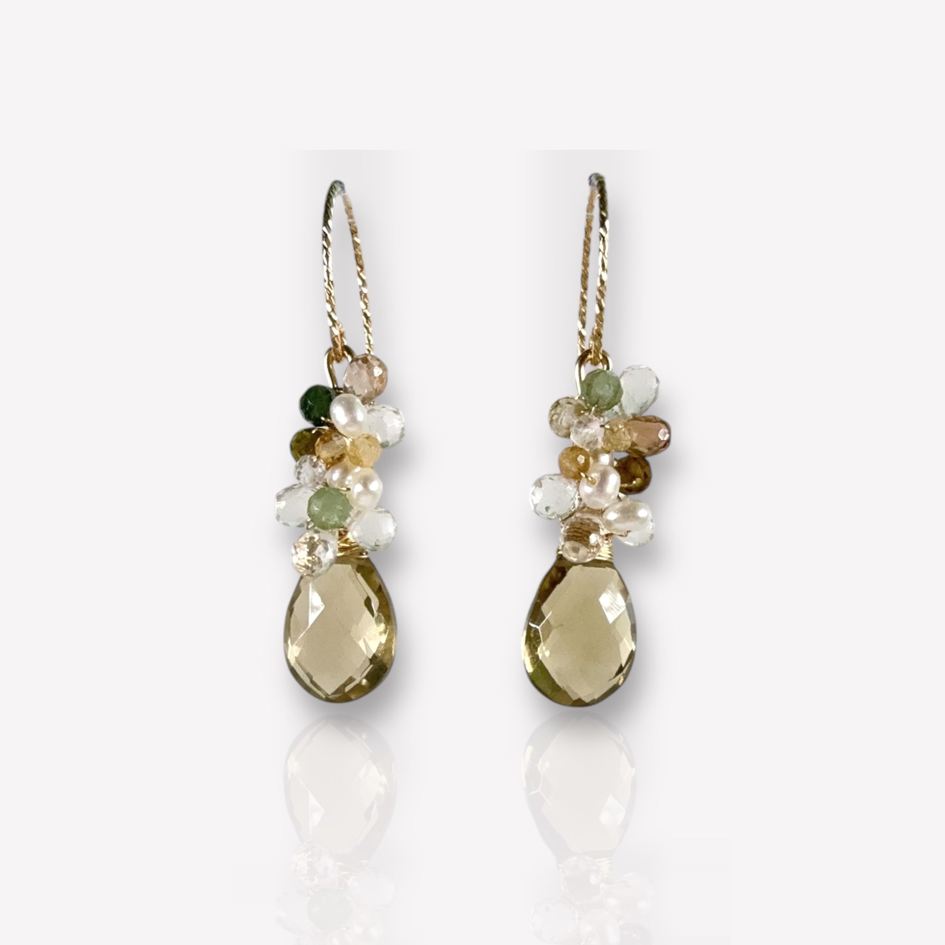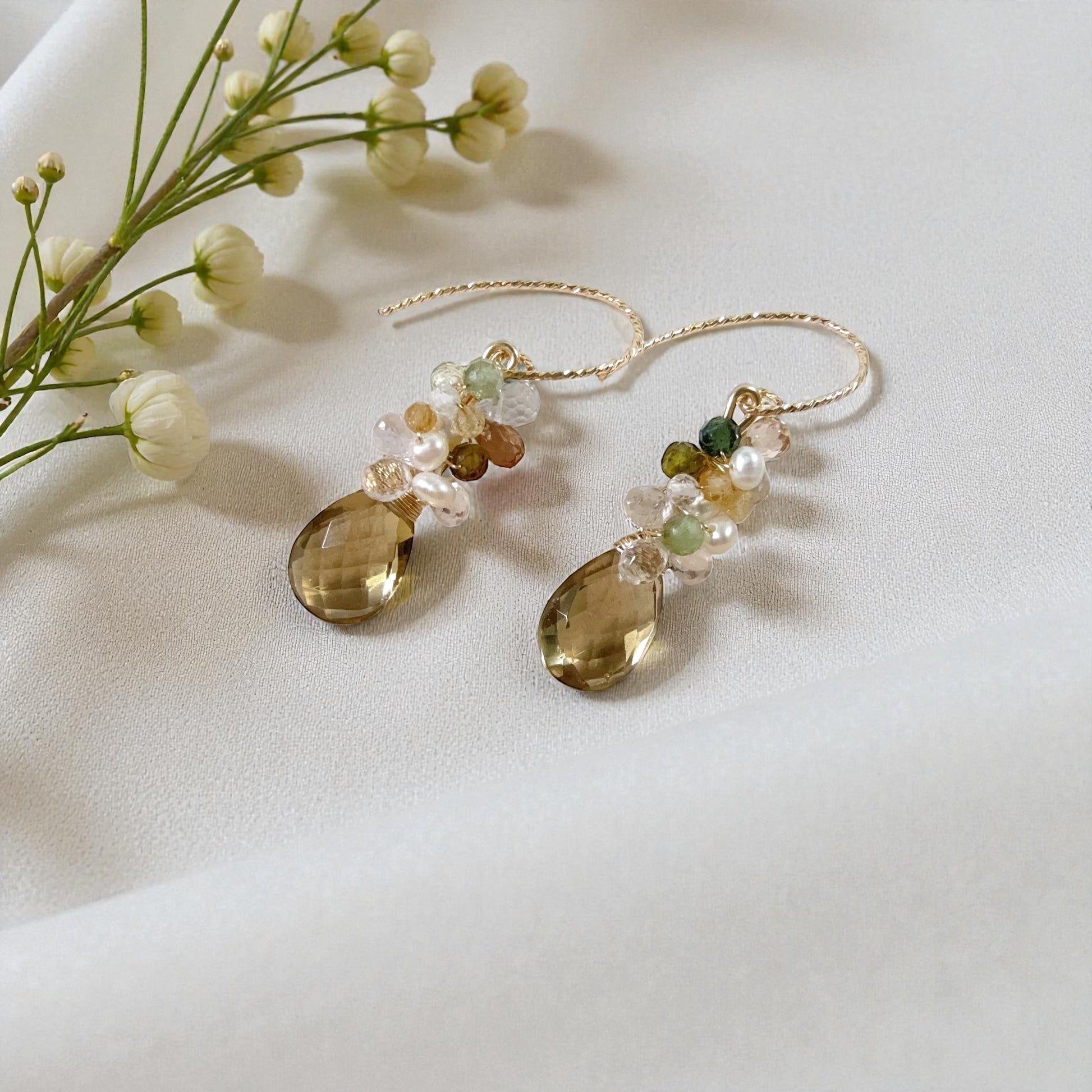 Lovely floral dangle earrings featuring faceted drop lemon quartz dangles with little gemstone and pearl beads.