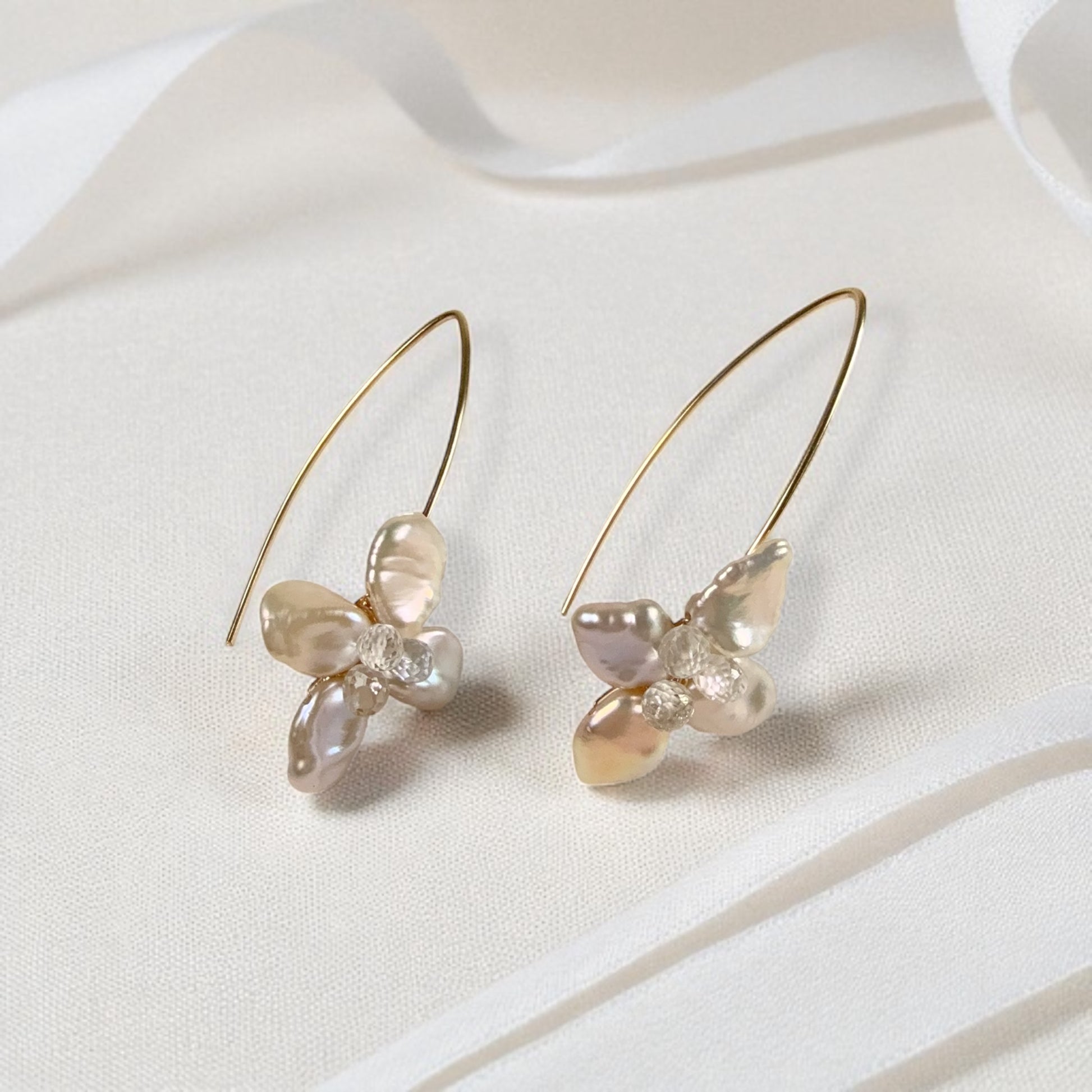 Elegant floral dangle earrings featuring baroque pearl and briolette white topaz wrapped as a flower on 14k gold filled wire.