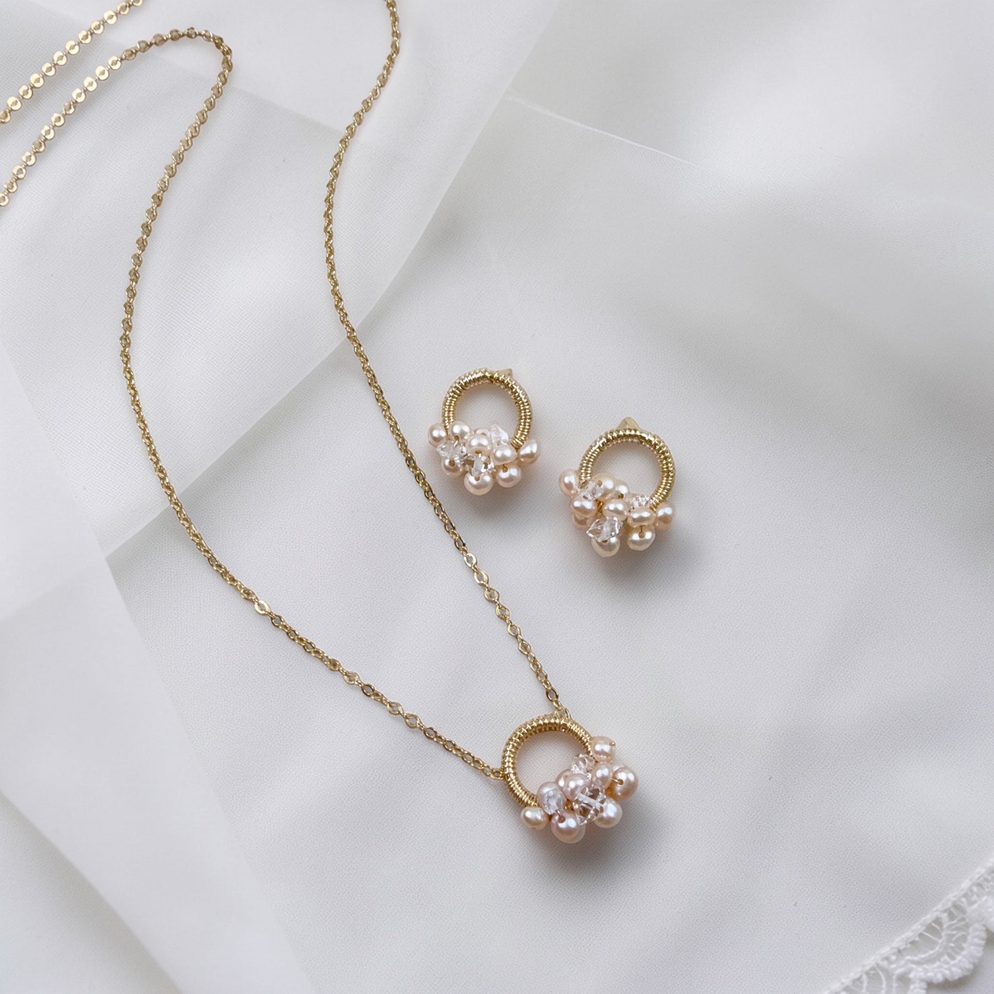 Little pink pearl beads and gemstone wrapped with 14k gold filled loop stud earrings.